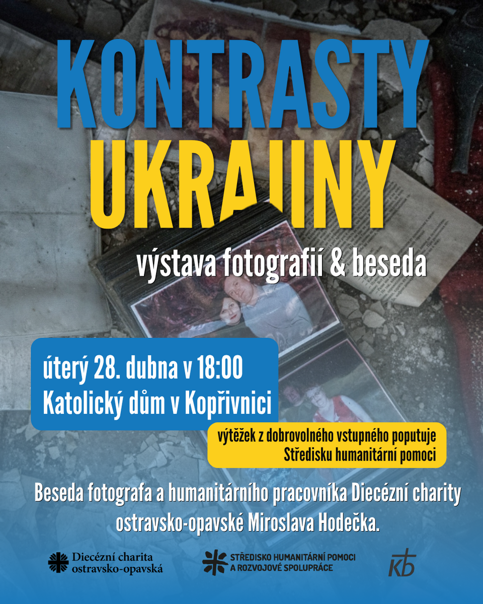 Přijměte pozvání na besedu spojenou s výstavou fotografií s názvem KONTRASTY UKRAJINY. V úterý 28. dubna v 18:00 v Katolickém domě v Kopřivnici přivítáme vedoucího střediska Humanitární pomoci a rozvojové spolupráce Diecézní charity ostravsko-opavské Miroslava Hodečka.